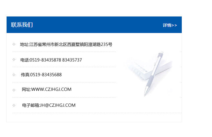 地址:常州市新北區友邦商務大廈1幢16、17層  電話:0519-85101652  傳真:0519-85112595  郵編:213022  網址:www.cz-jiayue_cn.szjinxin1688.com  郵箱:xiajifengaa@163.com